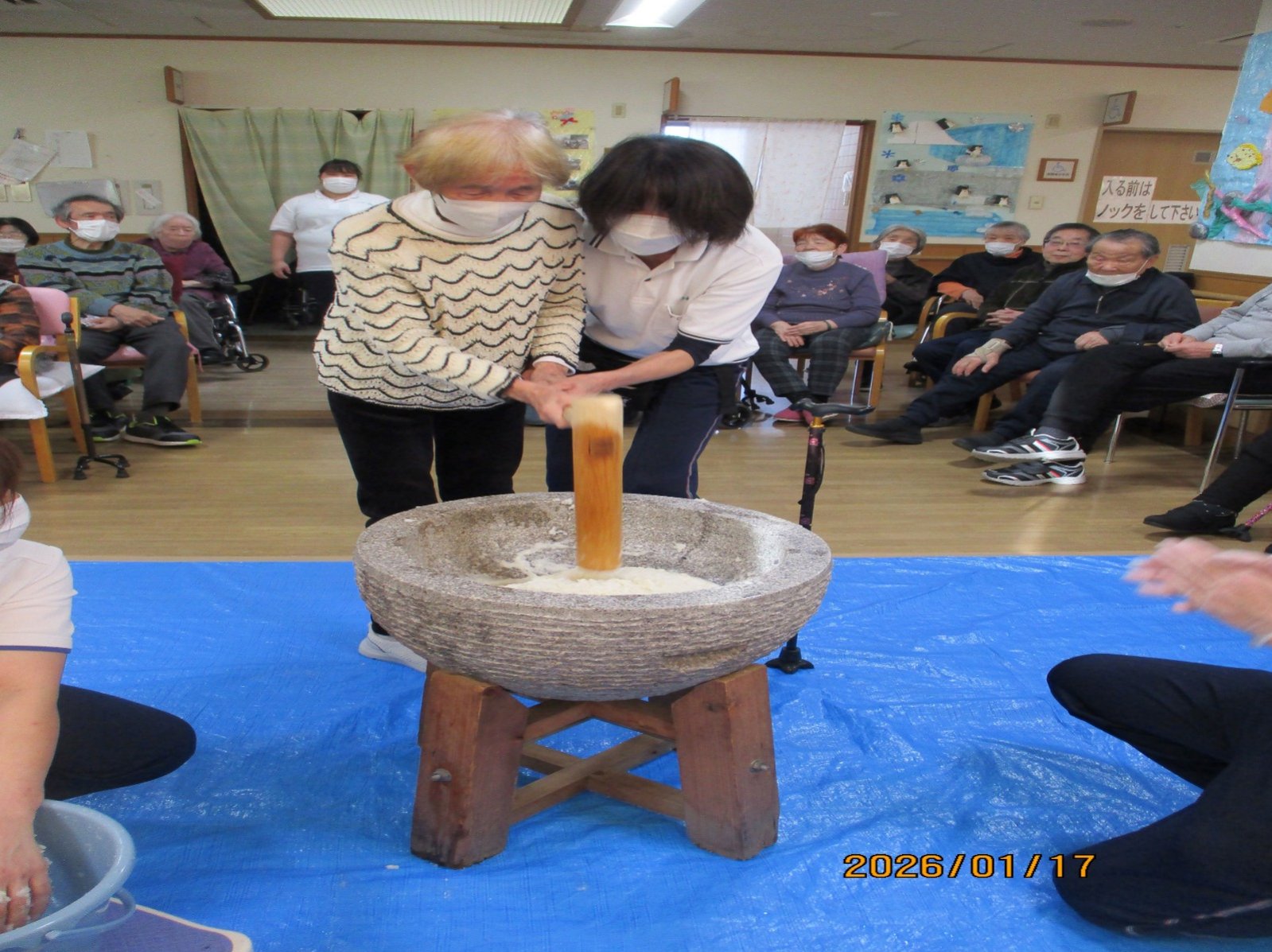 2026年1月17日(土)にふれあいデイケアで毎年恒例の餅つき大会を行ないました。昔取った杵柄・・・という言葉通り、利用者様皆様、杵柄を握ると、勢いよく振り下ろされていました。周りの皆様も「よいしょー!!」と声を出し、楽しく賑やかに行なえました。つきたてのお餅は少しずつですが、皆様に食していただきました。(気をつけながら)